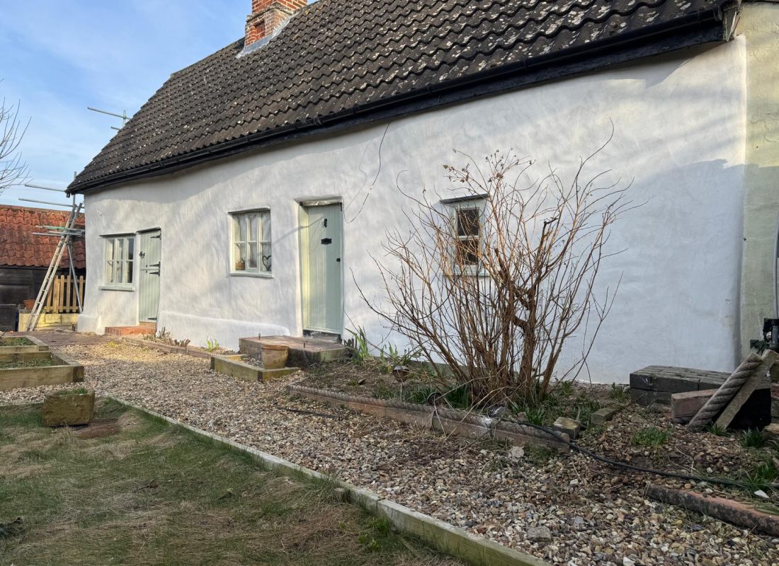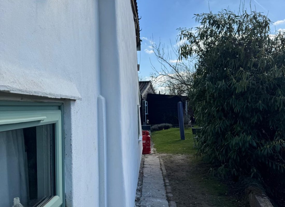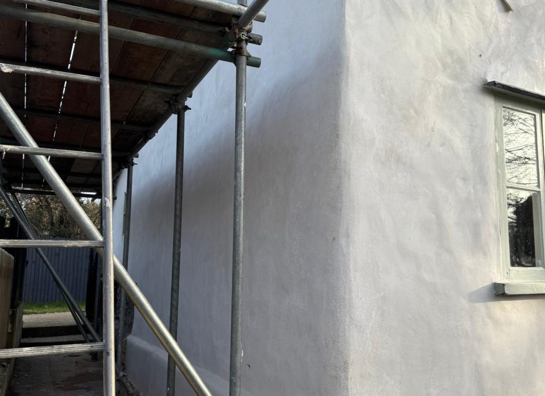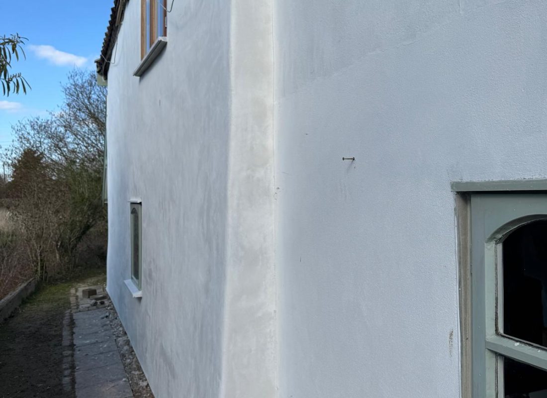 After multiple timber and plinth repairs, the property is now ready to be rendered with two coats of Anglia Lime’s fibre-chalk.