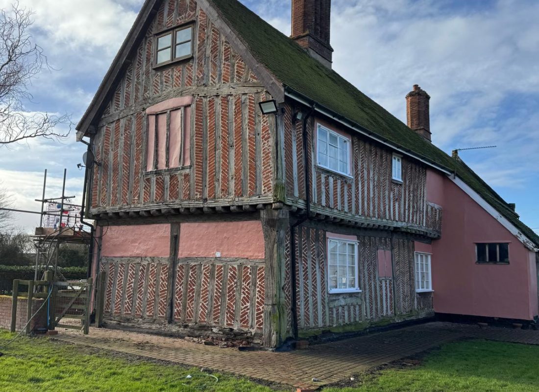 We completed repairs on both gable elevations and the front elevation (internal and external). The team stripped the sand and cement render, completed a full frame inspection and conducted timber frame and sole plate repairs in green oak where necessary, incorporating as much of the original timber where possible. We also completed a plinth repair on the biggest gable elevation.