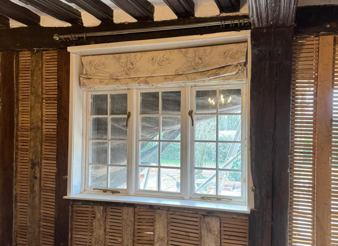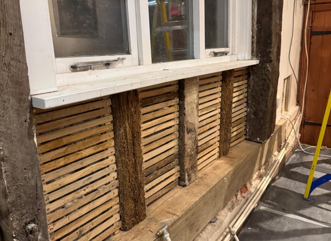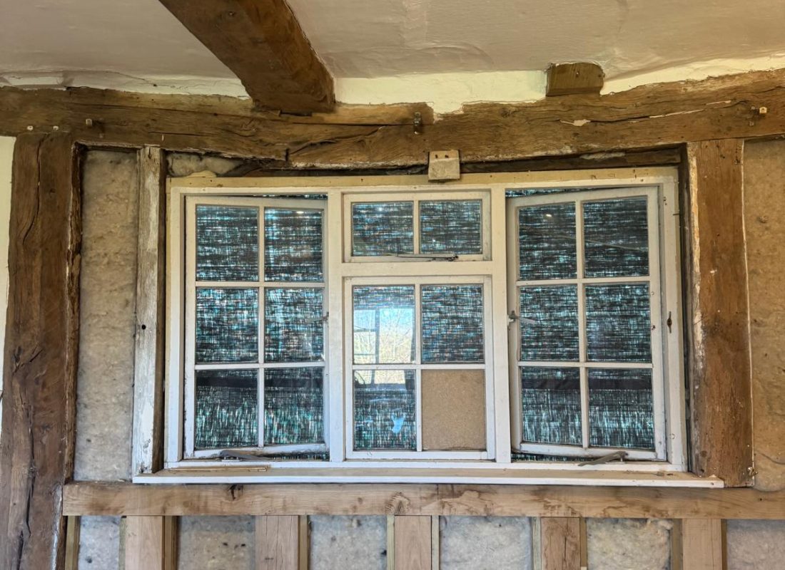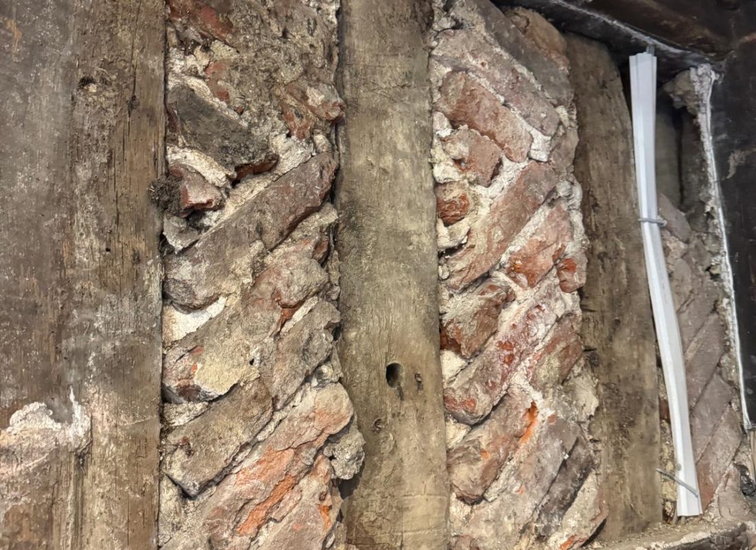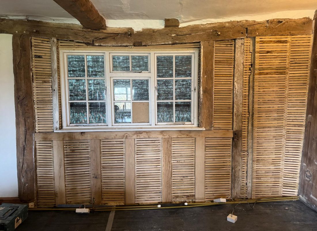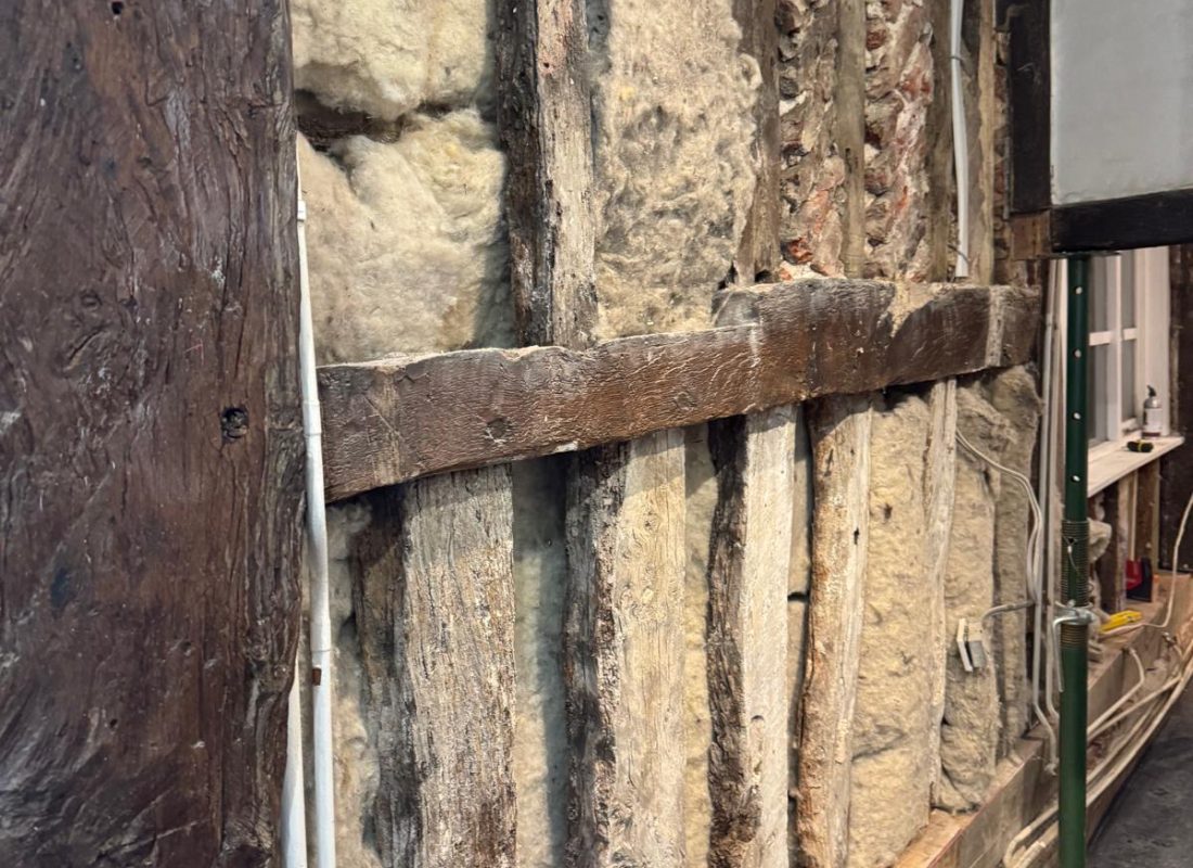 After the cementious render was removed, it exposed this stunning herringbone brickwork and beautiful 14th century timber frame. We’ve insulated with lambs wool, lathed in sawn oak lath consolidating and preserving the herringbone brickwork underneath.