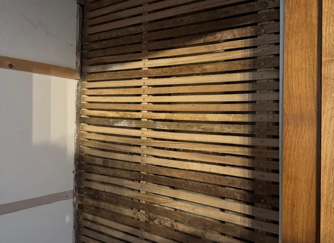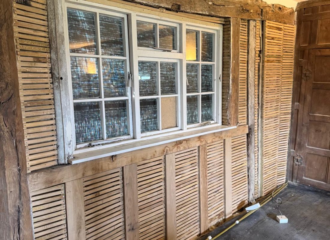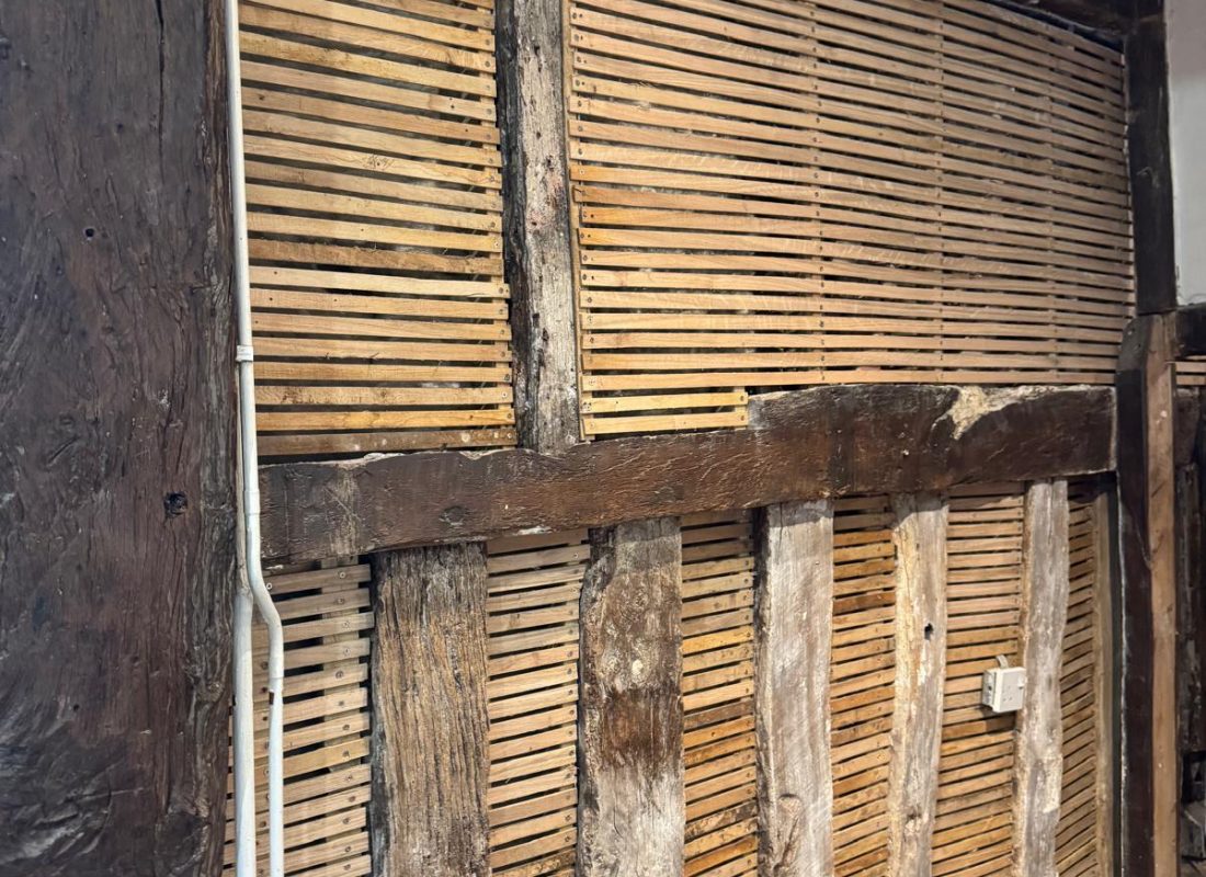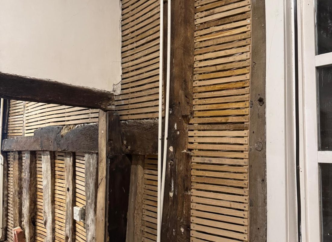 The original lime plaster in the stairwell had deteriorated, with a bitumen-backed wallpaper holding it together. After a dusty day of work, we stripped everything back to reveal the original timbers and daub. We consolidated the daub by lathing over it to preserve its historic integrity and made repairs to the original lath where possible.